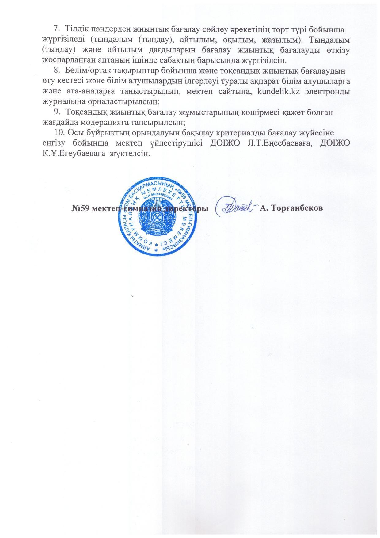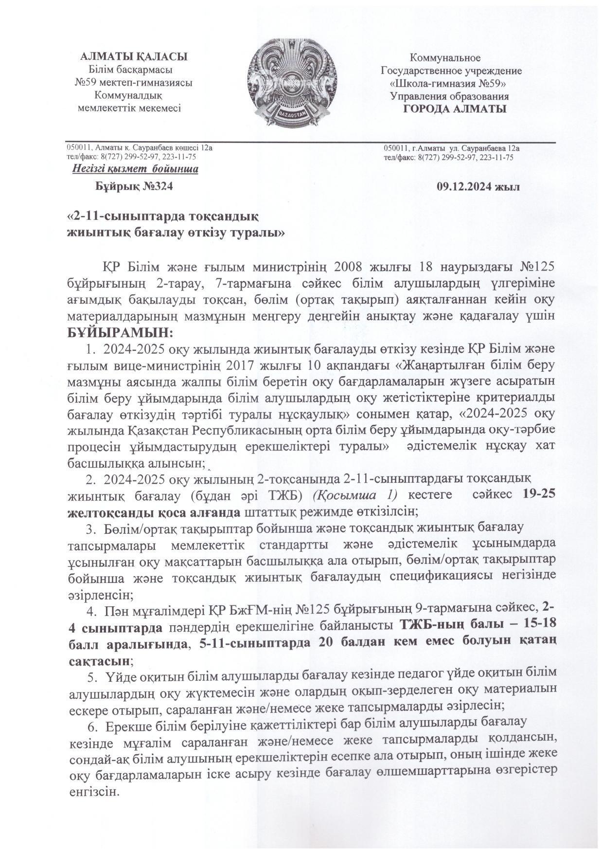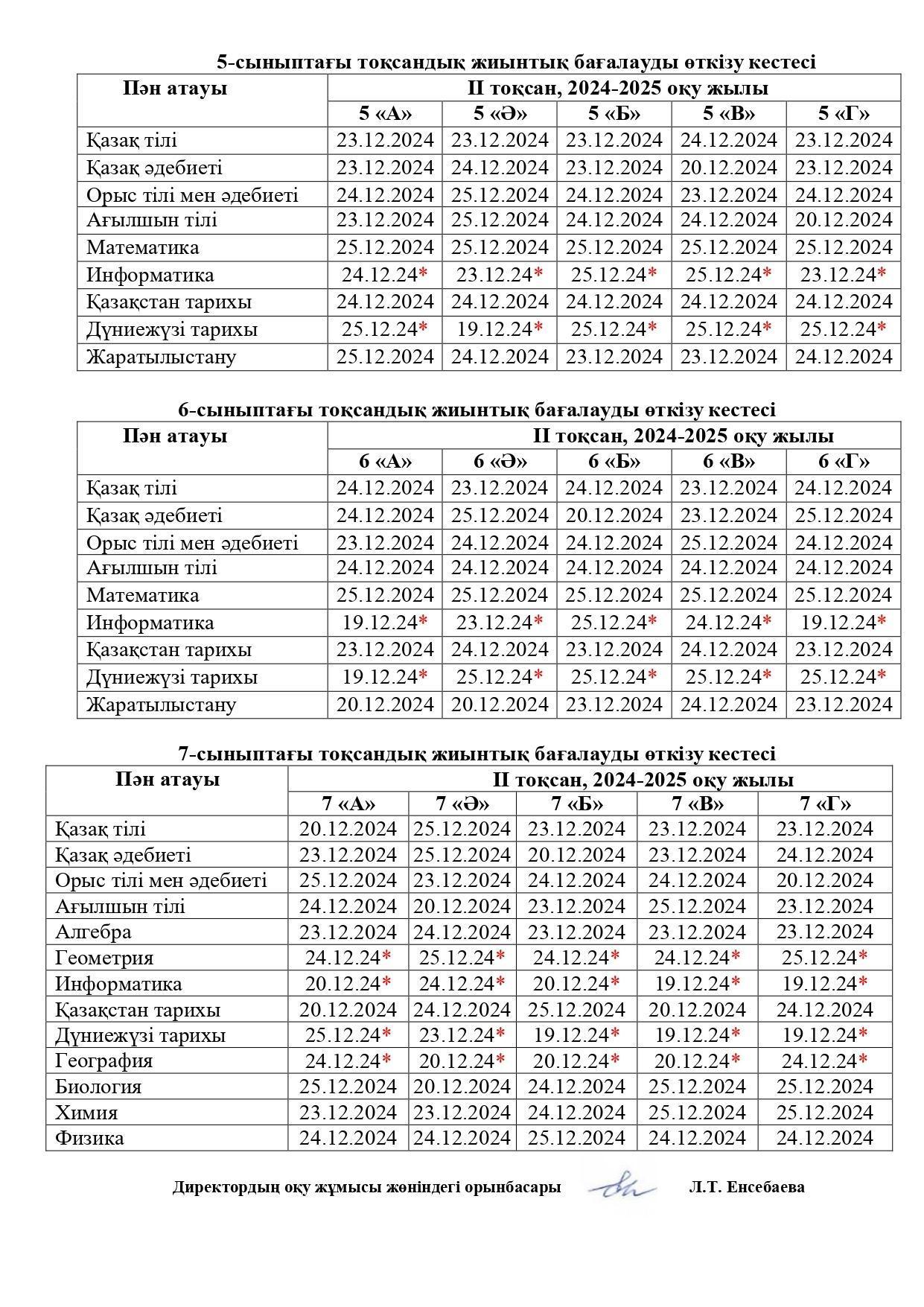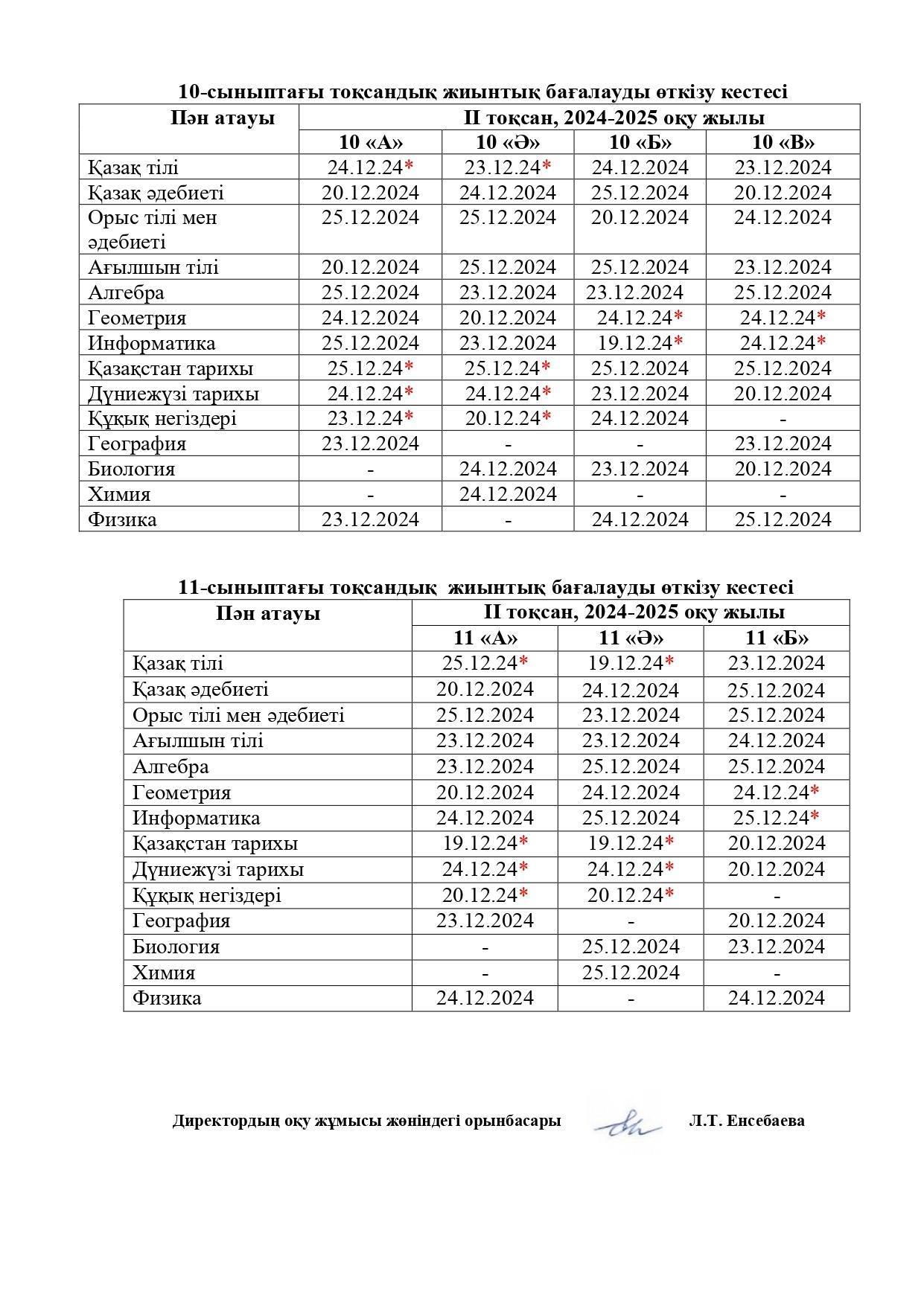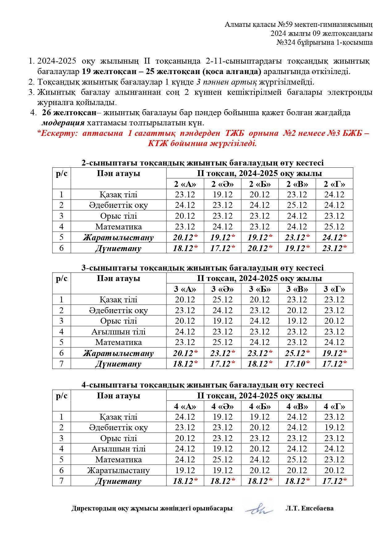 Тоқсандық жиынтық бағалау 19-25.12.2024 аралығында (қоса алғанда) өткізіледі.