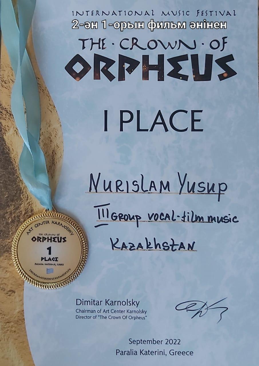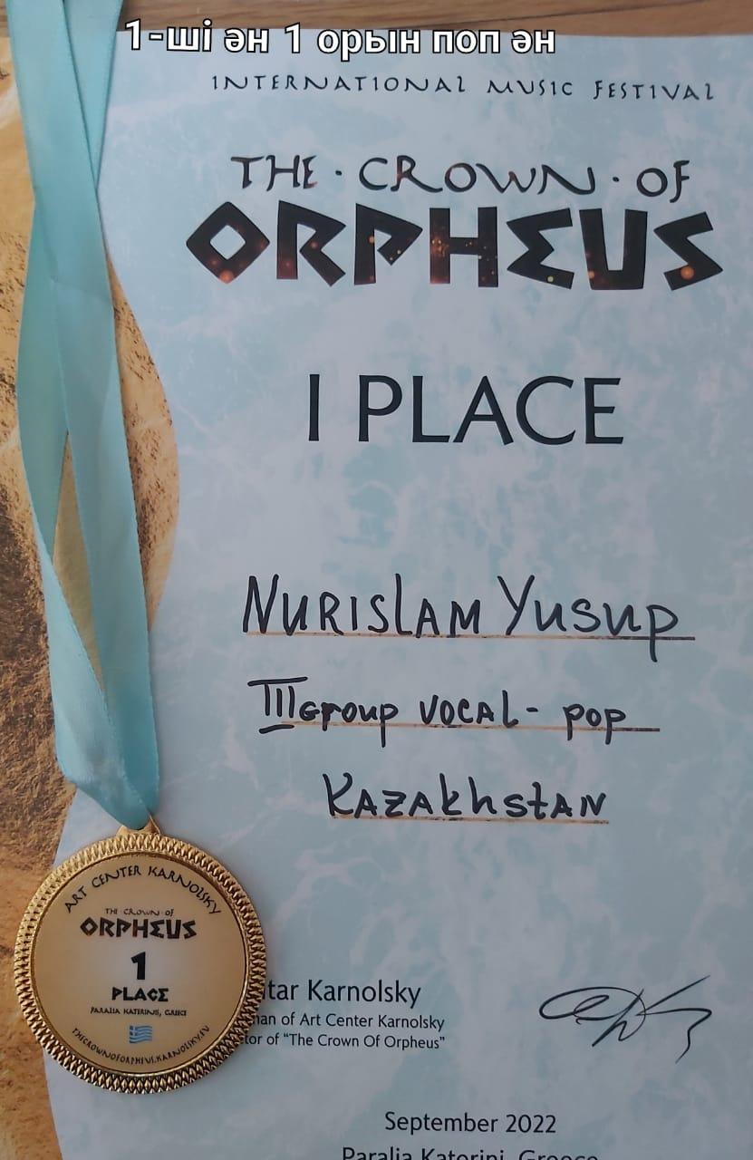 Қыркүйек айының соңында ежелгі Эллиндер елінде өткен «Корона Орфея» Халықаралық музыкалық фестивалінде №59 мектеп-гимназиясының 6 «В» сынып оқушысы Юсуп Нурислам Дауренұлы топ жарып, І орынды жеңіп алды. Жастайынан өнерпаз, ән айтуды жаны қалап тұратын Нурислам жас болса да бас болып, халықаралық деңгейде өткен байқауға қатысып, бағын сынап көрді. Нәтижесінде жүлделі бірінші орынға ие болып, елінің абыройын асқақтатты. Құтты болсын дейміз. Әрдайым осындай биіктерден көрініп, өнер көгінде қалықтап жүре берсін деп тілектстік білдіреміз.