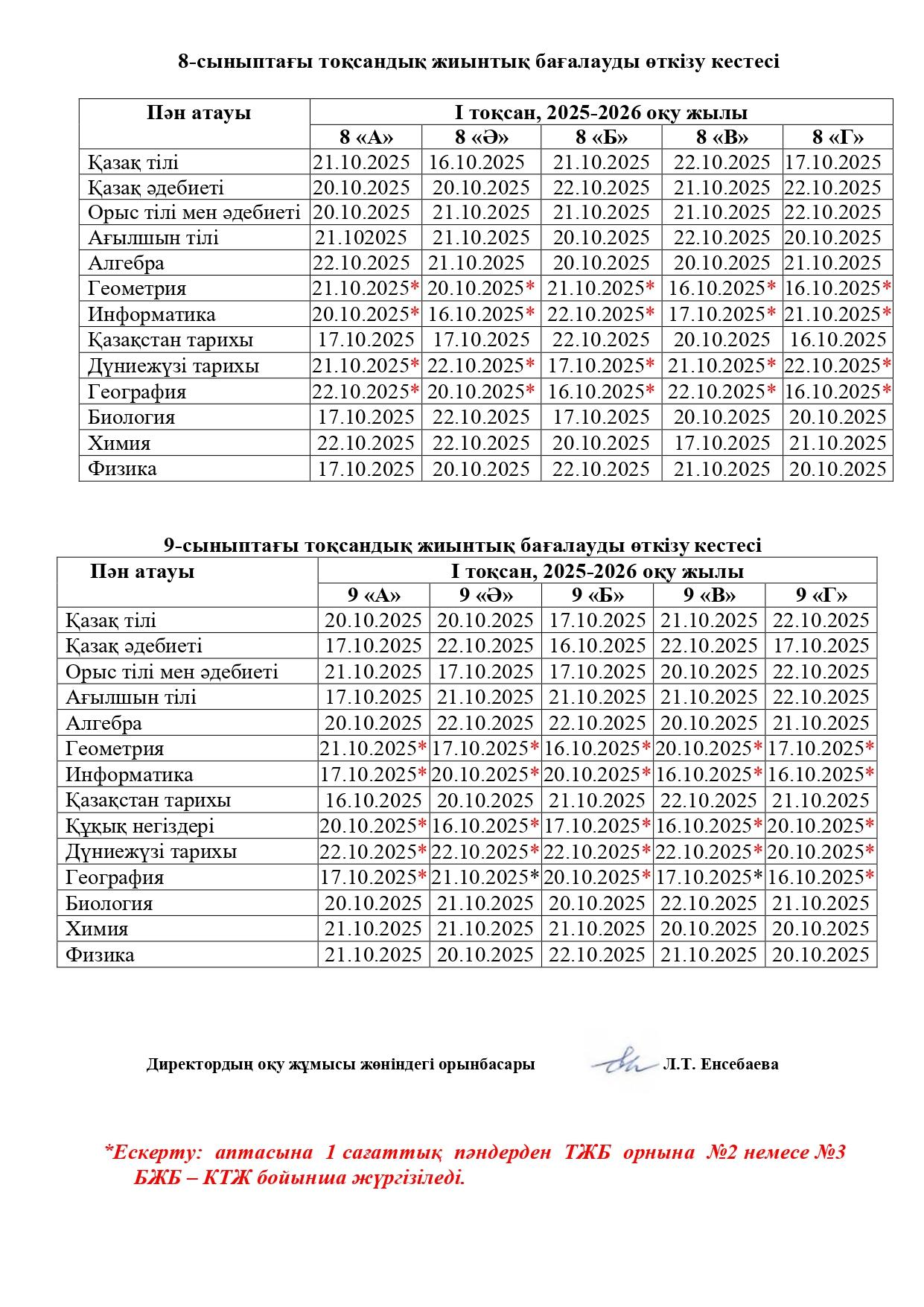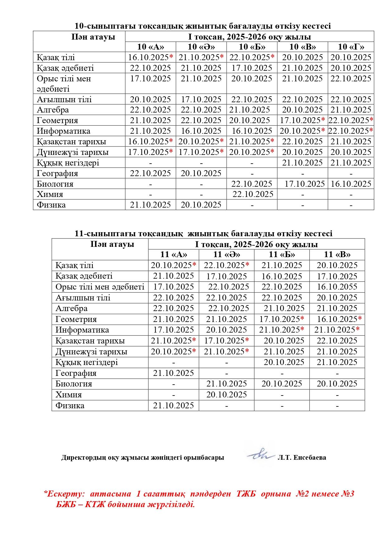 Тоқсандық жиынтық бағалау 16-22.10.2025 аралығында (қоса алғанда) өткізіледі.