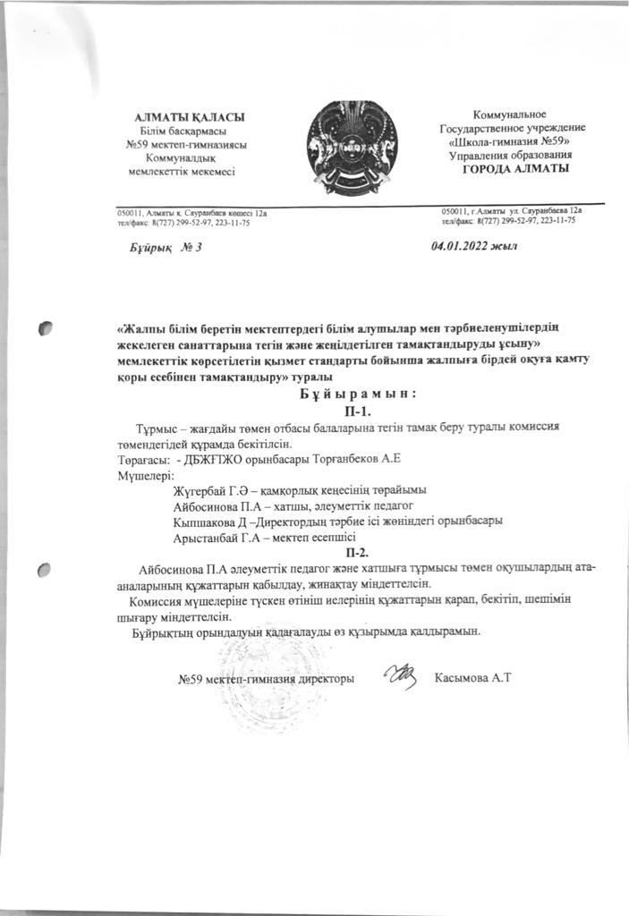 59 мектеп-гимназия » Тамақтандыру » "Жалпы білім беретін мектептердегі білім алушылар мен тәрбиеленушілердің жекелеген санаттарына тегін және жеңілдетілген тамақтандыруды ұсыну" туралы . Бұйрық №3