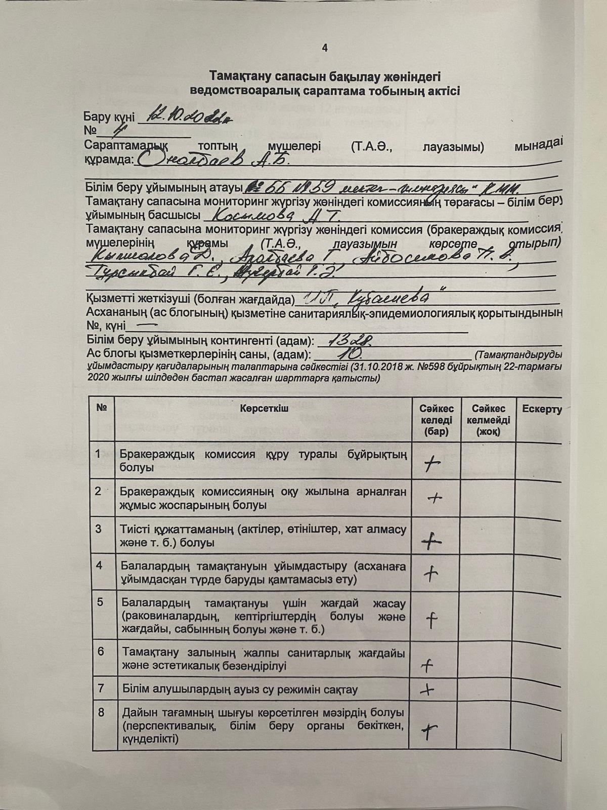 » » тамақтану сапасын бақылау жөніндегі ведомствоаралық сараптама тобының актісі 12.10.2022