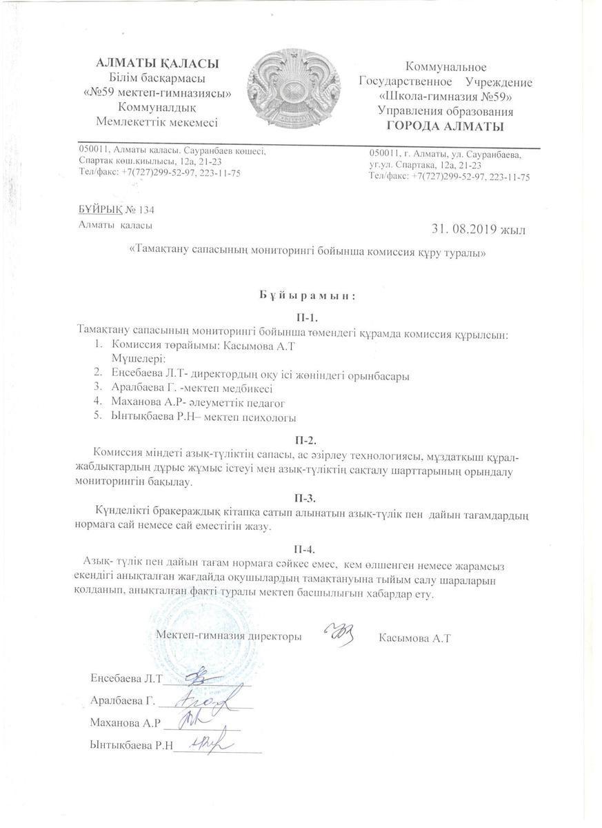 Тамақтану сапасының мониторингі бойынша комиссия құру туралы бұйрық