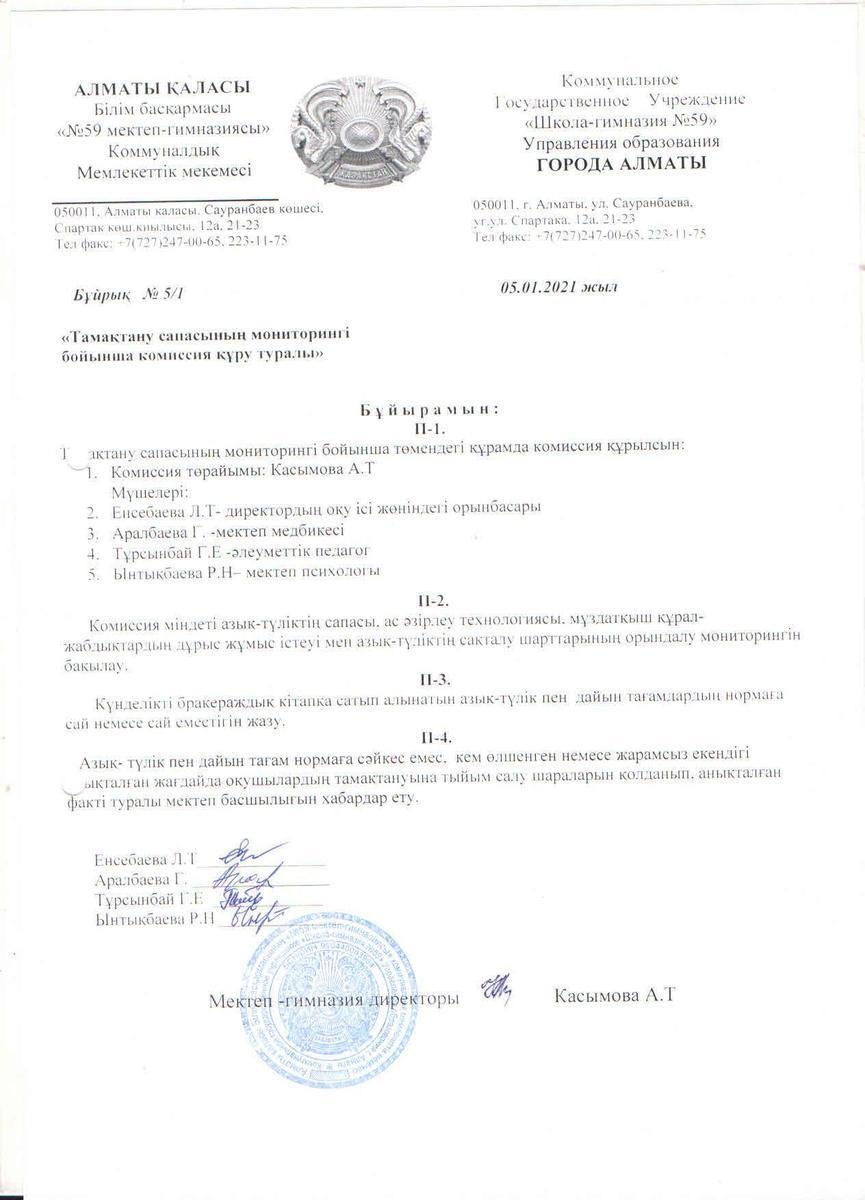 Тамақтану сапасының мониторинг бойынша комиссия құру туралы бұйрық