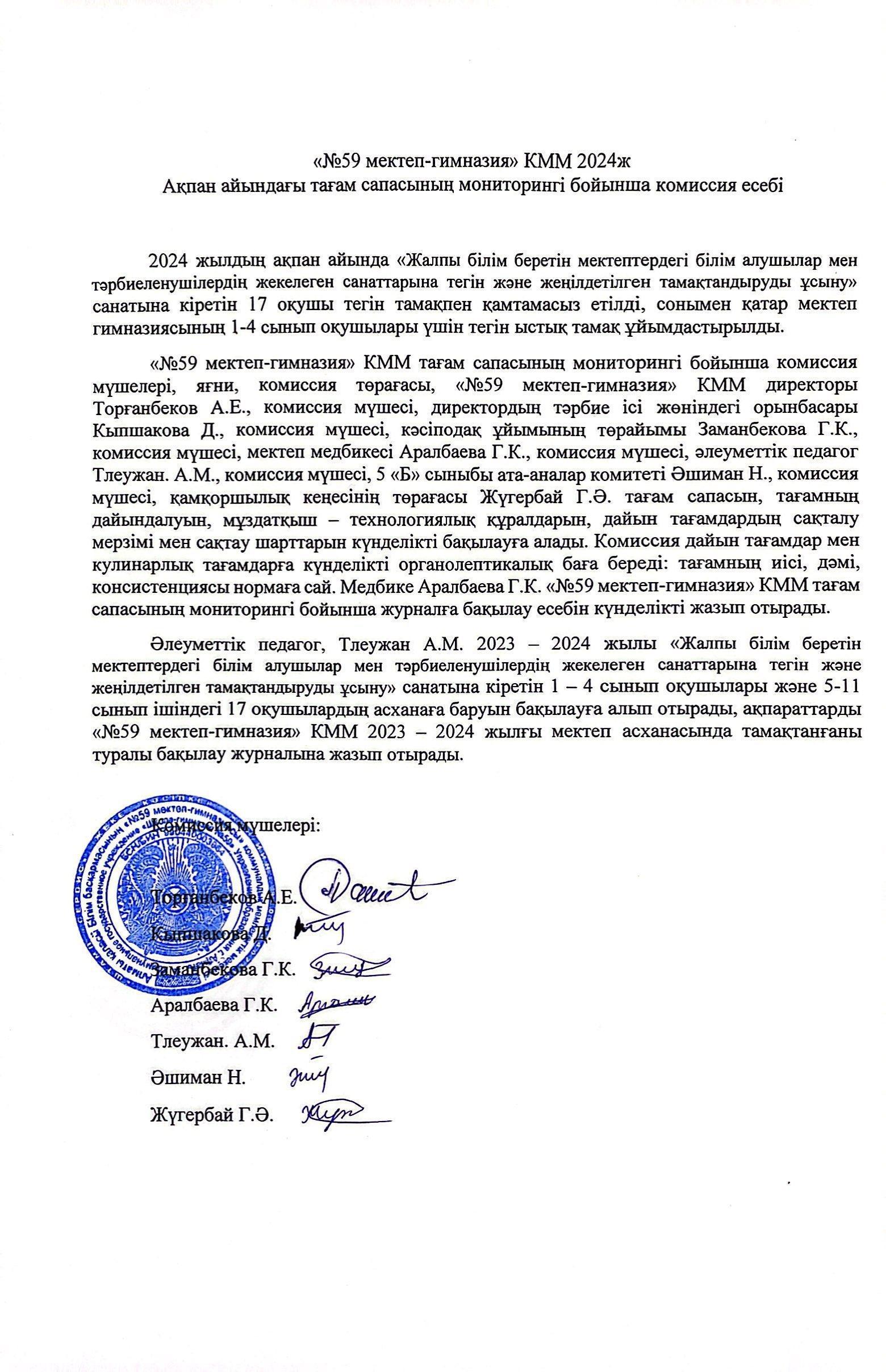 "№59 мектеп-гимназия" КММ 2023 жылдың қыркүйек айындағы тағам сапасының мониторингі бойынша комиссия есебі