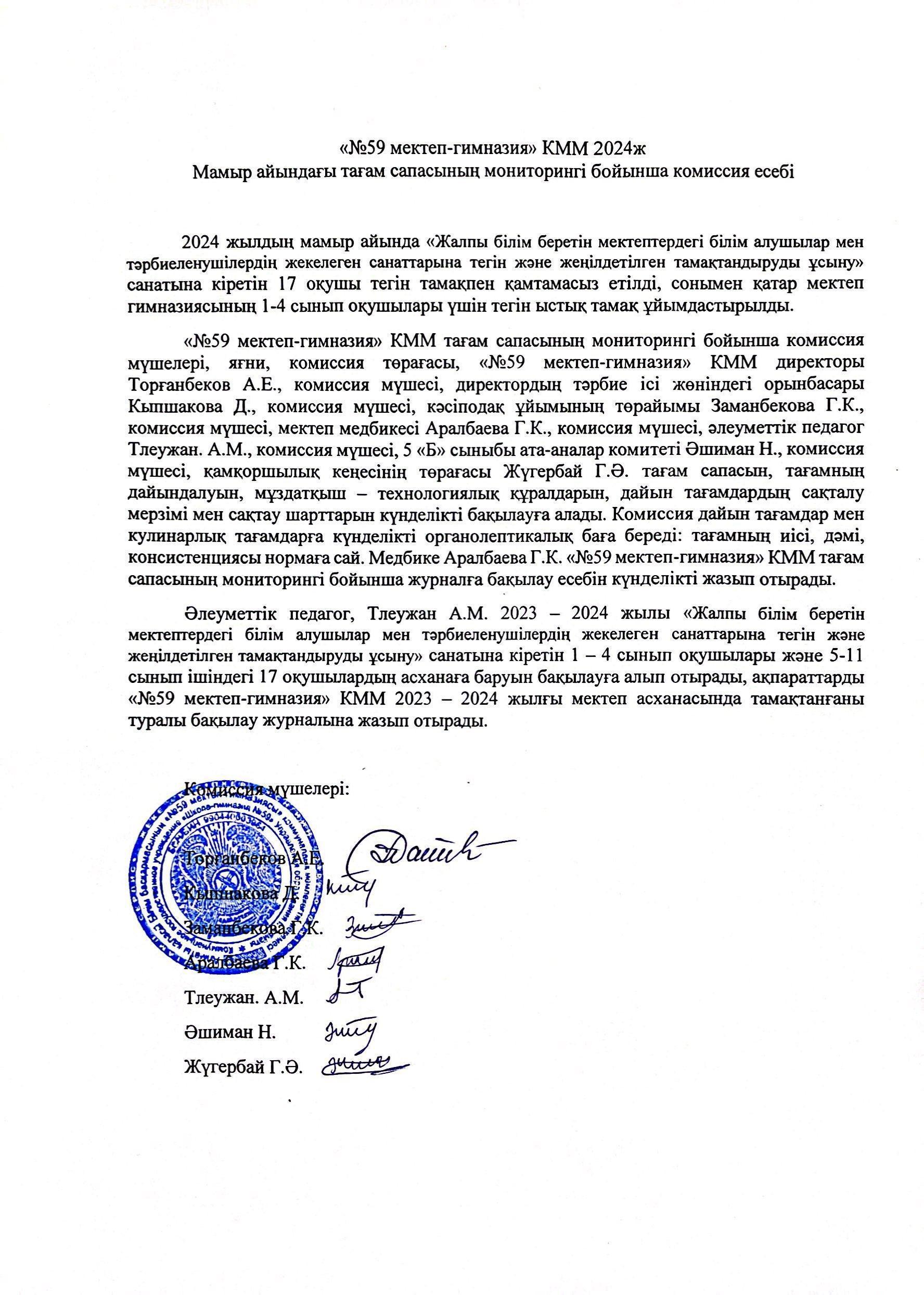 "№59 мектеп-гимназия" КММ 2023 жылдың қыркүйек айындағы тағам сапасының мониторингі бойынша комиссия есебі