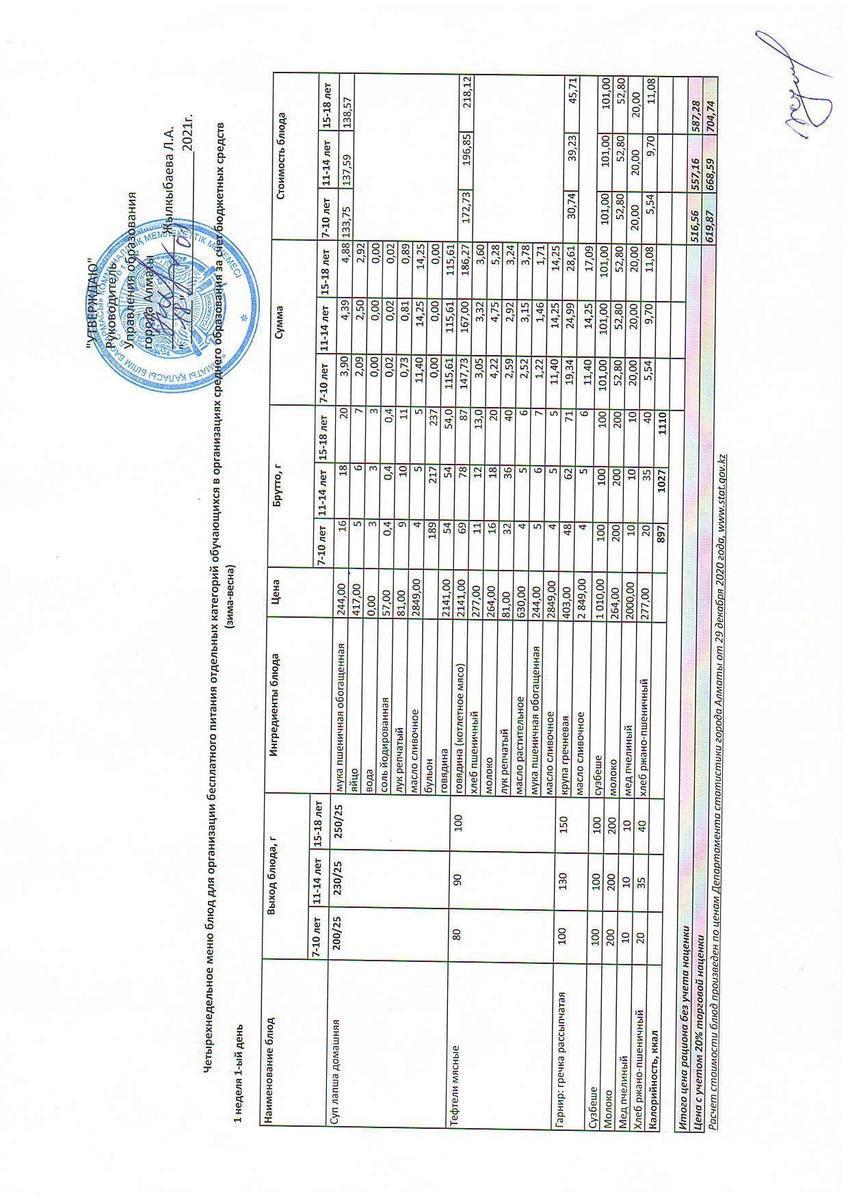 Меню Міндетті оқу қоры есебінен тегін тамақтанатын балаларға арналған апталық мәзірлер