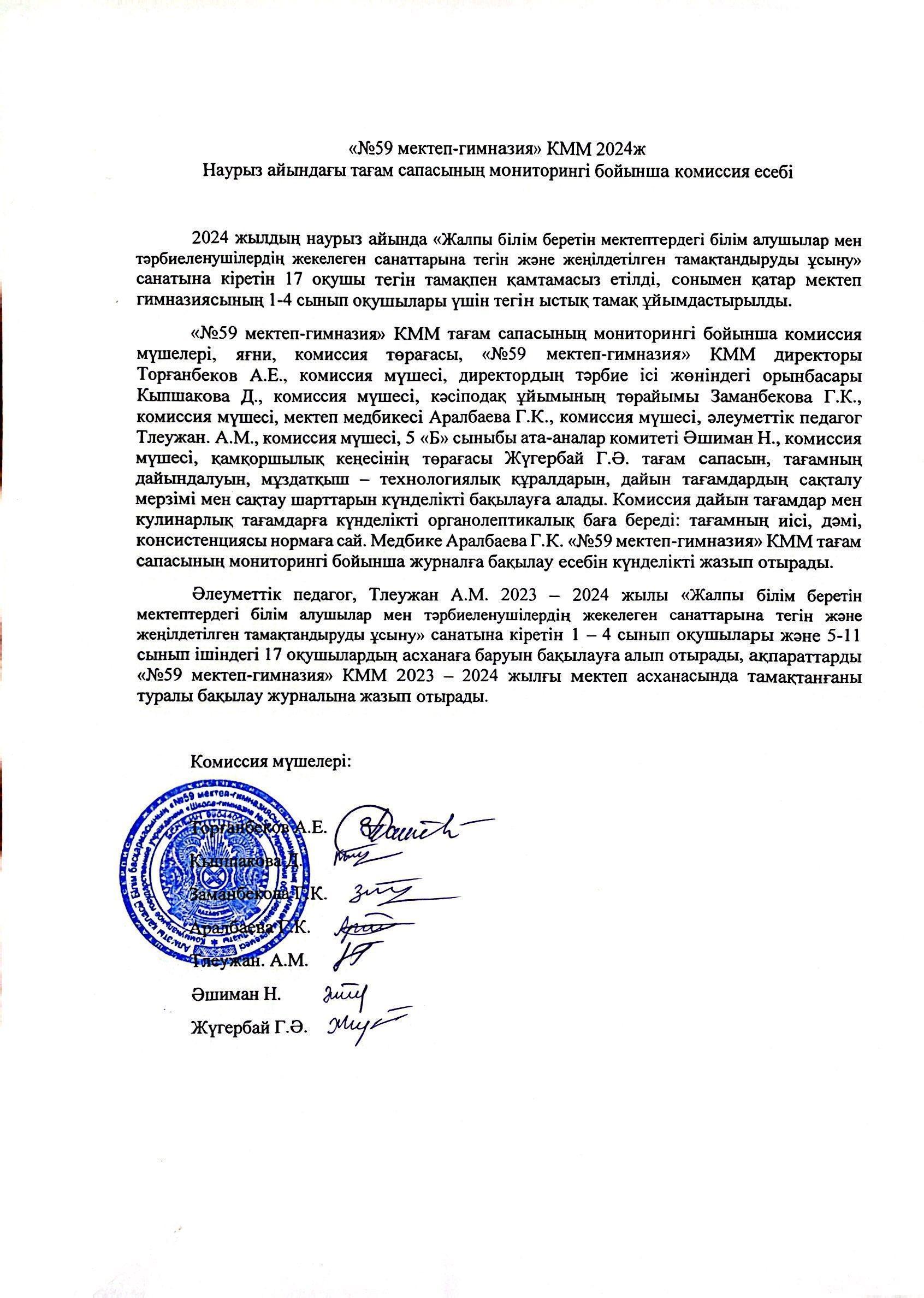 "№59 мектеп-гимназия" КММ 2023 жылдың қыркүйек айындағы тағам сапасының мониторингі бойынша комиссия есебі