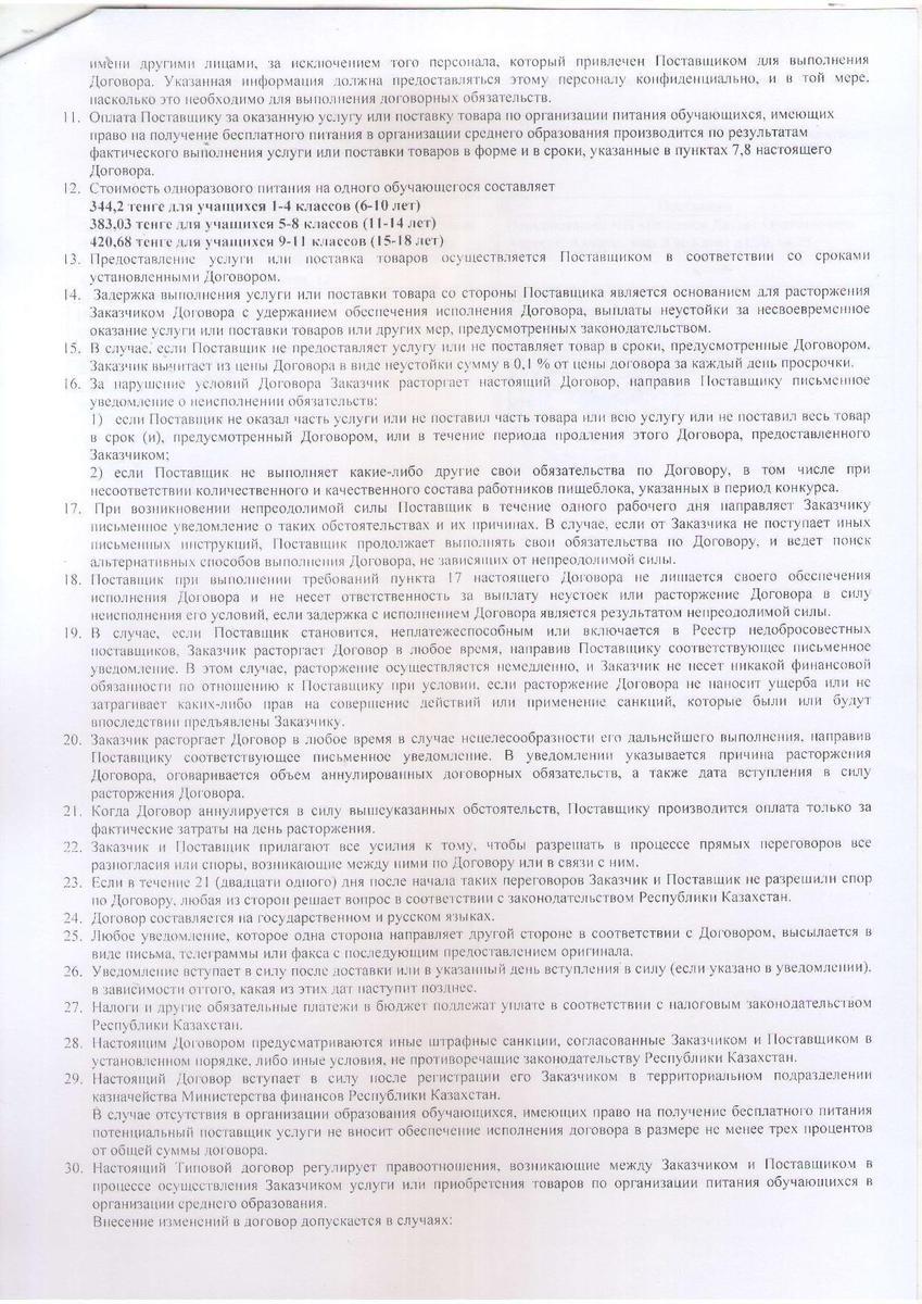Типовой договор. Об оказании услуги или поставки товаров по организации питания обучающихся в организациях среднего образования